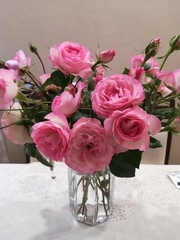 Восхитительная романтическая спрей-роза двухцветной окраски - белый с зеленоватым оттенком на наружных лепестках и нежно-розовый в середине, шарообразный, некрупный, 3-4 см в диаметре, густомахровый, собранный в соцветия по 5-10 шт. Появляются в больших кистях, которые выглядят как отдельные букетики. Куст аккуратной формы, стебли почти без шипов, листва тёмно-зелёная, полуматовая. Период цветения - с конца июня до первых заморозков, постепенное в течение всего сезона, обильное.